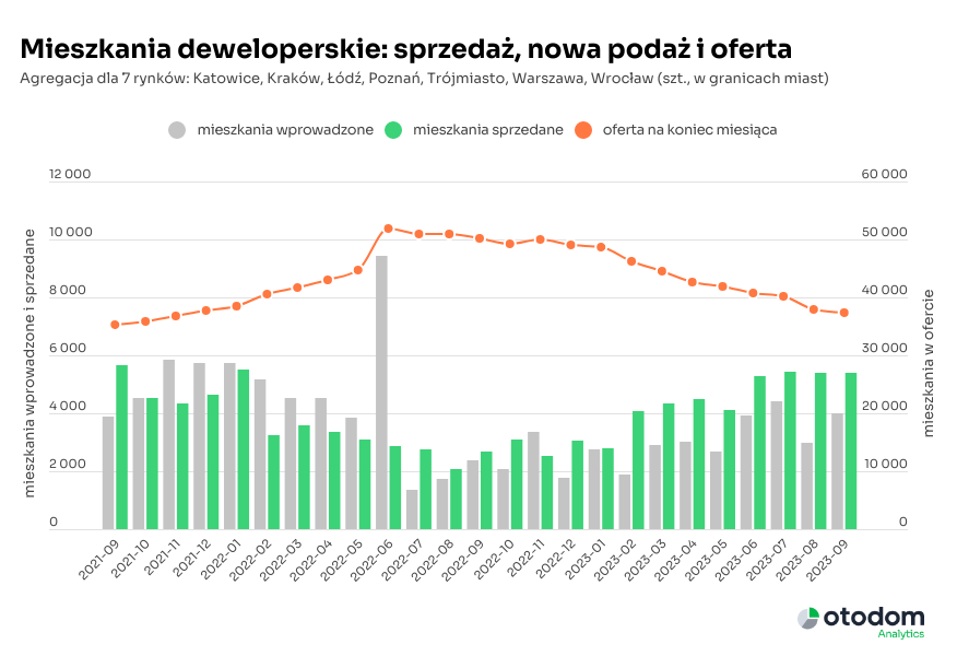 W samym wrześniu 2023 r. deweloperzy działający na siedmiu największych polskich rynkach (Warszawa, Kraków, Wrocław, Łódź, Trójmiasto, Poznań, Katowice) sprzedali 5,4 tys. mieszkań. W tym samym czasie wprowadzili do oferty 4 tys. lokali. I choć był to drugi najwyższy wynik w 2023 r., to kiepska pod tym względem zwłaszcza pierwsza połowa roku sprawiła, że różnica pomiędzy podażą a popytem powiększa się.