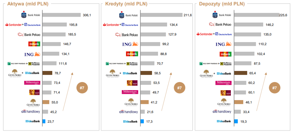 Podmiot po fuzji będzie miał także mocniejszą pozycję, czym łatwiej może przyciągnąć poszukiwanego inwestora. Według danych na koniec września 2018 roku, w wyniku połączenia powstanie siódmy pod względem wielkości bank w Polsce, dysponujący sumą bilansową blisko 80 mld zł i świadczący usługi dla ponad 2 mln klientów. Suma kredytów w nowym banku sięgnie 58,5 mld zł, depozytów zaś 65,4 mld zł. Oba wyniki również dają nowemu podmiotowi siódme miejsce na bankowej mapie Polski. Getin Noble samodzielnie zajmuje obecnie dziewiąte miejsce, po fuzji ma przeskoczyć więc dwa banki: Aliora i Millennium.