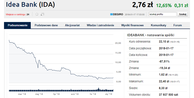 Warto jednak zauważyć, że ceny akcji obu banków potrafią się w ostatnich miesiącach szybko zmieniać, a sama właściwa wycenia tych spółek jest bardzo ciężka. Z jednej strony Getin Noble notuje straty oraz ma problemy z wypełnianiem wymogów kapitałowych (przez co musiał być dokapitalizowywany), z drugiej nad Ideą wisi niepewność związana ze sprawą sprzedaży obligacji GetBacku i ewentualnych odszkodowań, o które walczą obligatariusze podnoszący, że w feralne papiery zostali wrobieni przez pracowników Idei. Ciekawe w kontekście posesyjnego komunikatu wyglądają też czwartkowe notowania Idea Banku. Spółka urosła dziś o 12,7 proc. przy obrotach sześciokrotnie przewyższającej średnią za ostatni miesiąc (komunikat o fuzji pojawił się dopiero po sesji).
