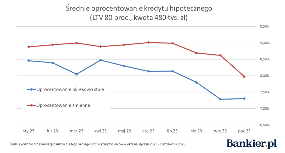 Przenieśmy się do 2023 r. Bazując na comiesięcznych rankingach kredytów hipotecznych, porównaliśmy oprocentowanie takiego samego kredytu (na 480 tys. zł, na 25 lat, z wkładem własnym 20 proc.) w dwóch wariantach – z oprocentowaniem okresowo stałym i zmiennym. Wykres prezentuje średnie wyliczone z symulacji przygotowywanych przez banki. Skład panelu ulegał lekkim wahaniom ze względu na zmiany w ofertach (czyli zawieszenie oferowania zmiennoprocentowych kredytów).