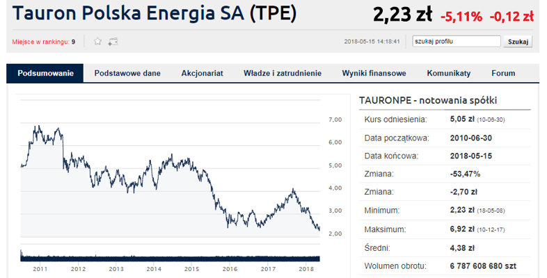 Najgwałtowniejsze spadki Tauronu to 2015 rok, gdy spółka dokonała gigantycznych odpisów, a politycy zamieszali ją w ratowanie sektora węglowego. Po odbiciu na przełomie 2016 i 2017 roku, gdy sektor węglowy odetchnął nieco po odbiciu cen, Tauron znów znalazł się w defensywie. Niewesołe perspektywy, stare elektrownie, niepewność polityczna i brak dywidend odbiły się na kursie spółki, ale także i jej konkurentów na czele z PGE.
