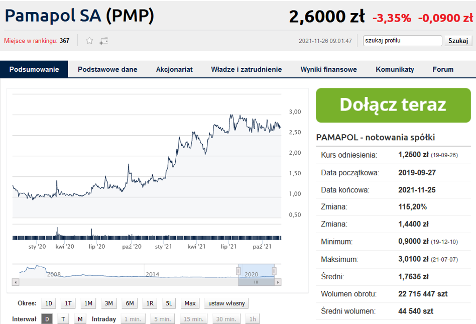 To przykład spółki, której notowania gwałtownie wzrosły po pierwszych informacjach o możliwości lockdownu. Kiedy jeszcze nie wiadomo było, jak on będzie wyglądać, klienci masowo rzucili się po artykuły pierwszej potrzeby, takie jak papier toaletowy czy zapasy żwyności. Zyskały takie spółki, jak Pamapol czy Makarony Polskie. Dziś już wiadomo, że problemów z dostawami artykułów spożywczych nie było, ale chwilowe zwyżki tych spółek w tamtym czasie na wykresie wpisały się w trwający dalej trend wzrostowy. Piątek przynosi jednak spadek kursu Pamapolu o ok. 3,3 proc.