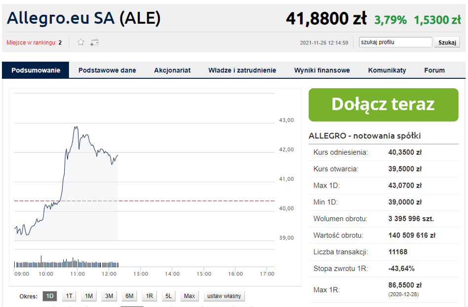Ubiegłoroczny debiut Allegro na GPW idealnie wpasował się w nastroje na rynku związane z wprowadzanymi obostrzeniami. Jako platforma e-commerce odpowiadał na zwiększony odsetek transakcji handlowych przeprowadzanych w sieci. Wkrótce po debiucie kurs osiągnął 98,78 zł przy cenie emisyjnej 43 zł pozwolił zarobić blisko 130 proc. Jednak to już przeszłość, a kurs w ostatnich dniach zszedł poniżej ceny emisyjnej. Piątek jest odreagowaniem spadków Allegro, które obok Mercatora jako jedyne wyraźnie rósł w WIG20 o ok. 2,7 proc., mimo że początej sesji przyniósł nowe minimum na poziomie 39 zł.