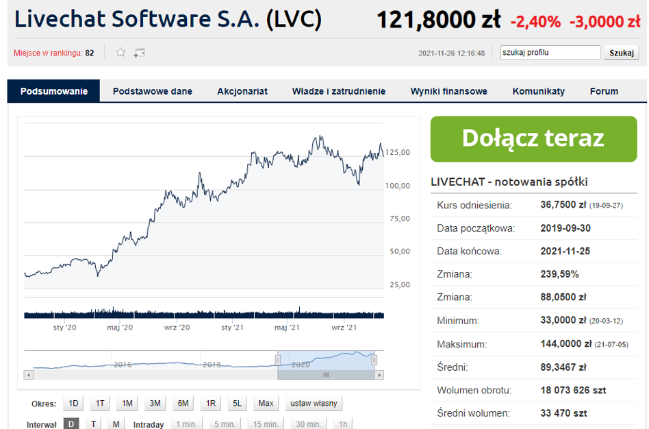 Wrocławska firma jako producent oprogramowania komunikacyjnego dla biznesu była głównym beneficjentem zmiany zachowań wymuszonych przez lockdowny. Od covidowego dołka z kwietnia 2020 r. kurs wzrósł o prawie 270 proc. do szczytu z lipca tego roku. Zwiekszony popyt na oprogramowanie firmy oraz silny dolar cały czas przekładają się na rosnące z kwartału na kwartał wyniki. Te opublikowane wczoraj to wzrost zysku o 28 proc. rok do roku i kolejny raz pobite oczekiwania analityków. Kurs akcji jednak jest w korekcie od lipca i oddał ponad 10 proc. Piątkowa sesja pogłębia spadki, ściągając kurs o ok. 3,3 proc.