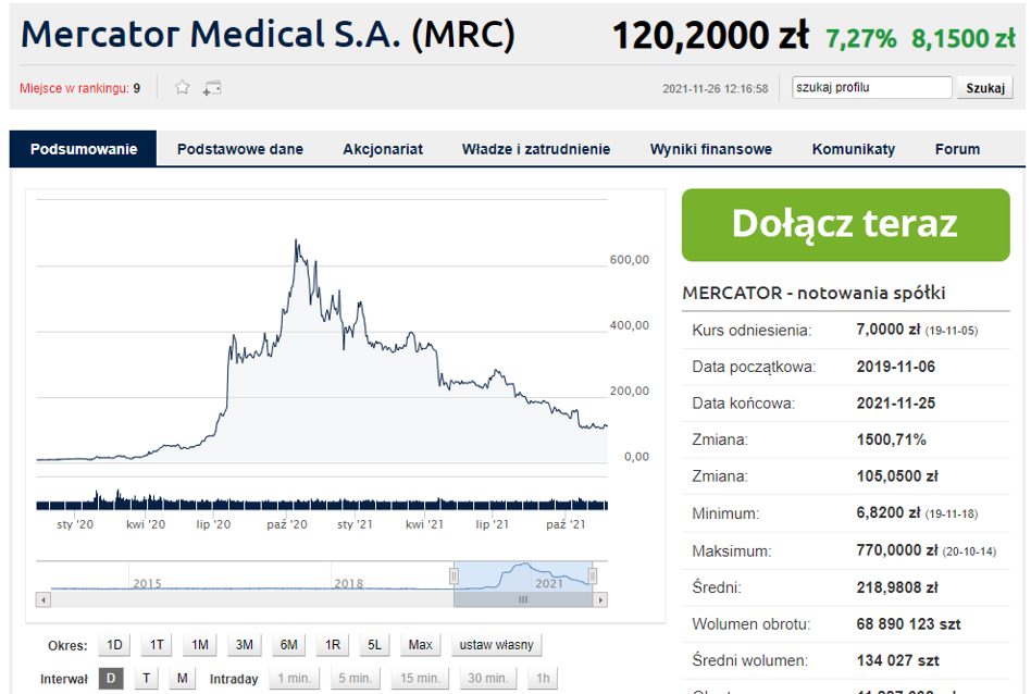 Black Friday nie na Mercatorze. Spółka jako jedna z dwóch z WIG20 rośnie i to wyraźnie. W okolicach godziny 13.00 notował ok. 8,6 proc. wzrost. Kurs od szczytu w październiku 2020 r. oddał do wczoraj ponad 80 proc. ze swojej wyceny w związku z pogarszającymi się kwartalnymi wynikami i spadkiem marż za rękawice medyczne, którego jest producentem. Zyski, które firma wypracowała na ogromnym popycie ze strony służb medycznych, wywindowały cenę z ok. 10 zł na początku 2020 r. do 770 zł we wspomnianym październiku. Kurs Mercatora od kilku dni jednak powoli piął się w górę i dziś jest najwyżej od październikowego zjazdu po przedstawionych szacunkach wyników.