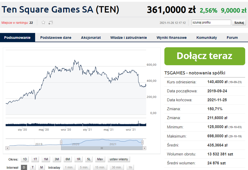 Producenci gier zaliczą pandemiczny rok 2020 do udanych dla sowitych giełdowych wycen. Kurs wielu producentów w zeszłym roku osiągnął swoje historyczne maksima, ponieważ miały one korzystać na ograniczonej aktywności ludzi poza domem i zwiększonemu zainteresowamiu rozrywką w domu. Ten Square Games jako przedstawiciel branży swoje maksimum osiągnął w październiku ubiegłego roku. Niestety dalszy okres to dla branży wyraźna bessa. Indeks WIG-Games od swojego szczytu, który przypadł na początek listopada 2020 r., oddał ok. 40 proc. Ostatnie dni to próba odbicia od wielomiesięcznych minimów. W piątek kurs ok. godz. 13.00 zwyżkował o ok. 2,6 proc.