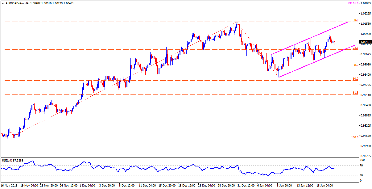 While nearby upward slanting trend-channel defines the AUDCAD rise, the pair recently turned down from 1.0080 immediate resistance and is indicating further decline to 23.6% Fibonacci Retracement of its November – December 2015 up-move, near 1.000 psychological magnet. If the accelerated downside pressure pulls the pair to below 1.0000 levels, the mentioned channel's support, near 0.9960, may limit its further decline, which if broken can magnify the pair's southward trajectory towards 0.9830-40 support-zone, 61.8% Fibo, near 0.9700 and the 0.9660 are likely important levels for the pair trader to watch. However, the pair's continued up-move beyond 1.0080 can propel it to the channel resistance of 1.0130 prior to its rally towards December highs of 1.0170 while further advances beyond 1.0170 might well witness the 61.8% FE of the mentioned move near 1.0270.