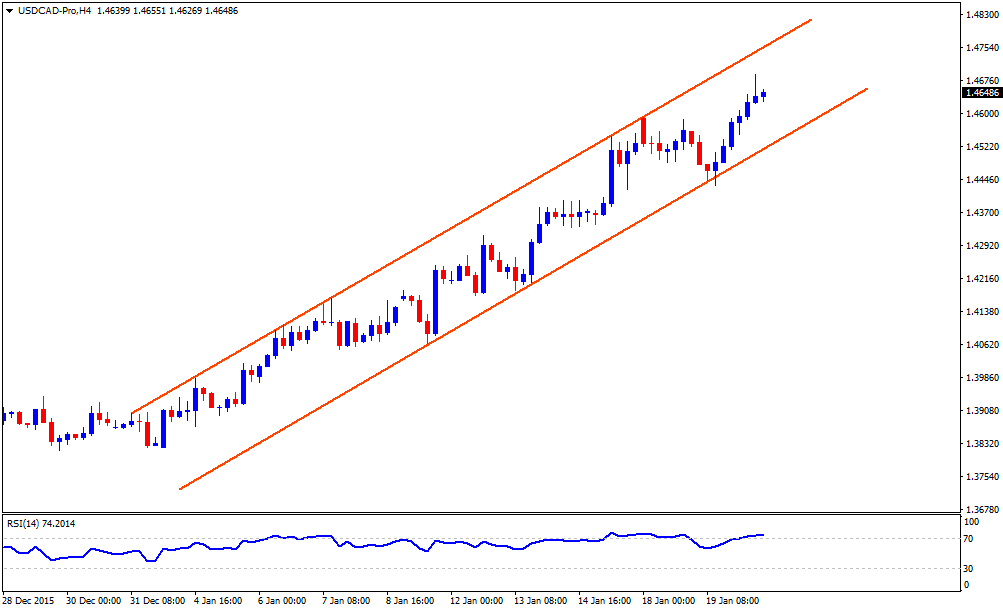Even as the short-term ascending trend-channel favors USDCAD up-move, failure to surpass the 1.4700 mark indicates pair's pullback to 1.4590-85 immediate support, clearing which the channel support, around 1.4500 mark, becomes crucial for the pair traders to watch. If the Bank of Canada (BoC) surprises the markets by no rate cut, the pair can dip below 1.4500 which opens the door for its short-term correction to 1.4400 and the 1.4180-70 support-zone. Meanwhile, a rate-cut and a dovish speech by the Canadian central bank's Governor can fuel the pair to channel resistance, near 1.4780-85, before targeting the 1.4900 and the 1.5000 psychological magnet while continued aggression by the pair beyond 1.5000 may find it difficult to break 1.5085 – 1.5100, surpassing which it can quickly rise to 1.5335-50 area.