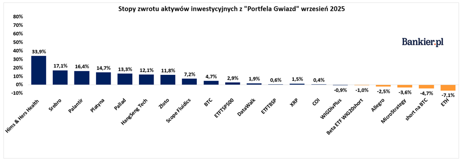 Przechodząc do laureatów wrześniowej rywalizacji o jak najwyższą miesięczną stopę zwrotu, zgodnie z powyższym wygrał portfel Jarosława Grzywińskiego, byłego szefa Giełdy Papierów Wartościowych w Warszawie, a obecnie eksperta BCC od rynków kapitałowych i prezesa NASK SA. Zwycięstwo zapewnił mu wybór dwóch amerykańskich spółek: Hims & Hers Health i Palantira. Wynik jego portfela to 26,9 proc., co daje drugie zwycięstwo w Portfelu Gwiazd.