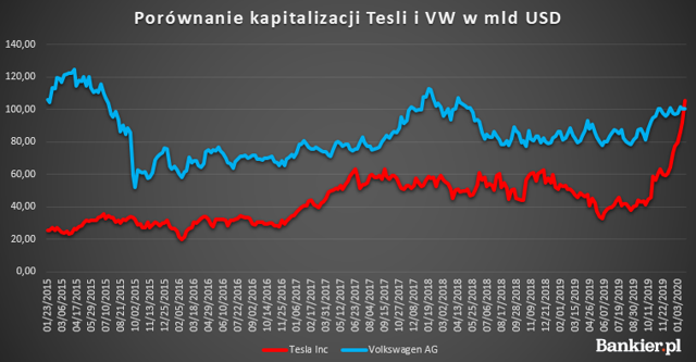 Na 100 mld dolarów nie był wyceniany jeszcze żaden amerykański producent aut, Tesla potwierdziła tym samym, że w oczach inwestorów jest daleko przed Fordem czy General Motors. Za sukces należy uznać też wyprzedzenie Volkswagena, to bowiem największy producent aut na świecie. Tym samym spółka Elona Muska stała się drugą największą motoryzacyjną firmą świata. Wyprzedza ją jedynie Toyota, której wartość przekracza 200 mld dolarów. Wiele spółek Tesla przebija jednak nawet dwukrotnie. Kapitalizacja Daimlera to 55 mld USD, BMW - 51 mld USD, General Motors - 50 mld USD, Hondy - 48 mld USD, Ferrari - 44 mld USD, a Forda - 36,4 mld USD.