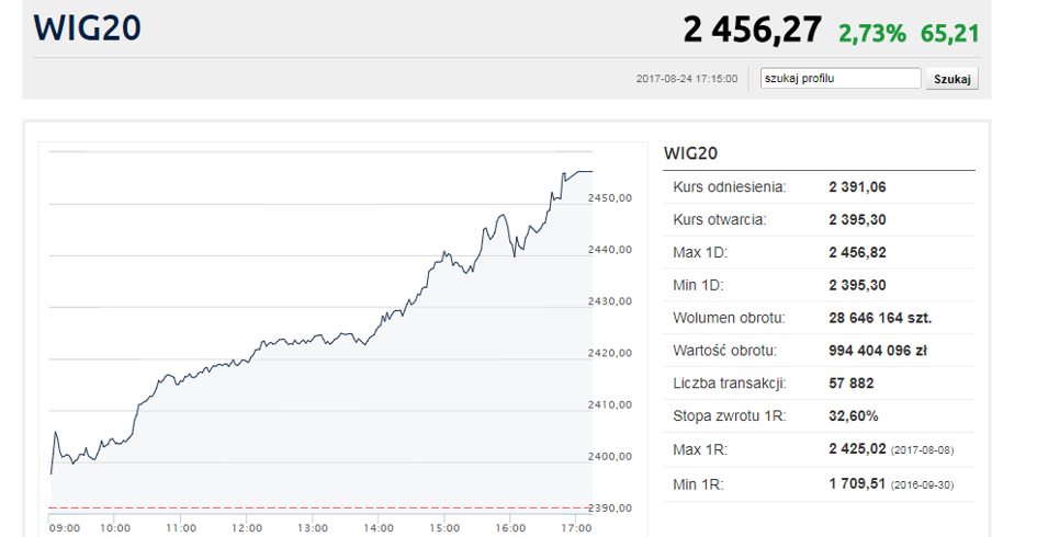 Ostatni dzień tygodnia przede wszystkim da odpowiedź, czy dzisiejsze wzrosty blue chipów nie były chwilowym wystrzałem. Podobna sytuacja miała już miejsce na początku sierpnia. Wówczas WIG20 podczas ataku na maksima również wyróżniał się na europejskim tle, jednak podczas kolejnej sesji znaleźć się w ogonie i potulnie wrócił pod granicę 2400 punktów.