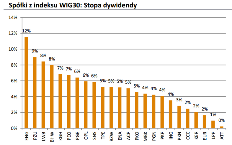 Wśród spółek z indeksu WIG30 o najwyższej stopie dywidendy analitycy Vestor DM wymieniają Energę, PZU, Bogdankę i Handlowy. Uwagę zwraca szczególnie ta ostatnia spółka, w sektorze bankowym istnieje bowiem ryzyko powtórki zeszłorocznego scenariusza, a więc narzuconych przez KNF ograniczeń w podziale zysków. Według analityków najwięksi gracze, tj. PKO, Pekao czy BZ WBK, powinni jednak spełnić wymagania pozwalające na wypłatę dywidendy.