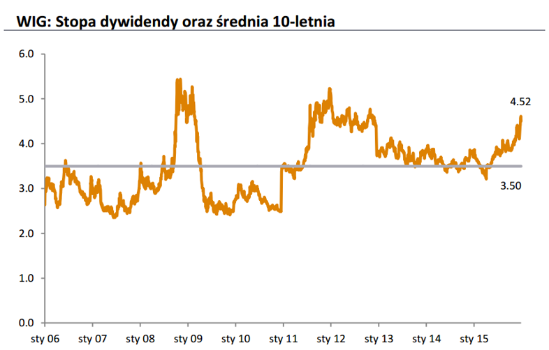 Akcje potaniały, większość wymienionych ryzyk nie miało jednak wpływu na wyniki za 2015 rok. To istotne, ponieważ zyskiem z tego właśnie roku spółki będą się niedługo dzieliły z akcjonariuszami. Ta dysproporcja pomiędzy wycenami a wynikami może być źródłem względnie wysokiego stosunku poziomu dywidendy do ceny akcji. Stosunek ten nazywany jest na rynku stopą dywidendy.