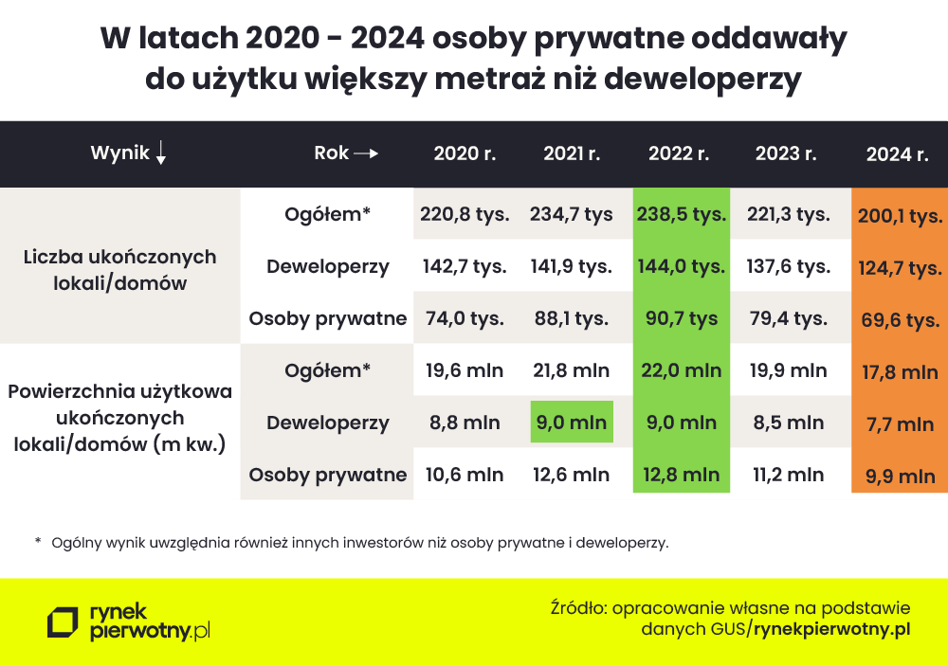 Jeżeli jednak spojrzymy na zeszłoroczne statystyki metrażowe, to okazuje się, że inwestorzy prywatni oddali do użytkowania 9,9 mln m kw. (praktycznie tylko domów jednorodzinnych), a deweloperzy „jedynie” 7,7 mln m kw. Sytuacja wyglądała podobnie na przykład w rekordowym roku 2022. Wtedy łączny ukończony metraż wyniósł 22,0 mln m kw. i tym samym został znacząco pobity gierkowski rekord z 1979 r. (17,7 mln m kw.).