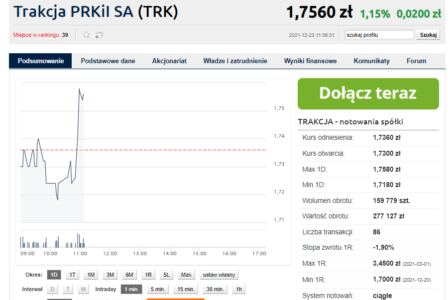 Kurs Trakcji rośnie po godzinie 11.20 o 4 proc., oddalając się od poniedziałkowego wielomiesięcznego minimum na poziomie 1,66 zł za jedną akcję.
