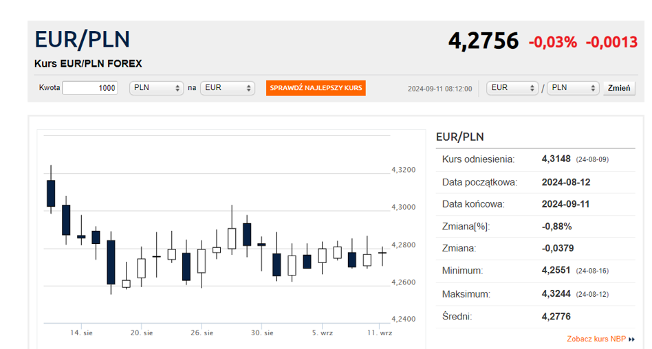 Stabilne pozostawały notowania euro do złotego. Kurs EUR/PLN wynosił w środę po godz. 8.00 4,2756 zł i był notowany na mniej więcej tym samym poziomie co dzień wcześniej o tej porze. We wtorek w czasie sesji złoty tracił, by później korygować to niewielkie osłabienie. Wsparciem mogło być podniesienie przez Agencję Fitch prognozy wzrostu gospodarczego Polski w 2024 i 2025 r. W kontekście polityki monetarnej warto wspomnieć o wypowiedzi Prezesa NBP A.Glapińskiego, który ocenił, że dyskusja o wejściu Polski do strefy euro będzie miała sens najwcześniej za 10 lat, gdy krajowa gospodarka osiągnie PKB wg parytetu siły nabywczej na poziomie Niemiec.
