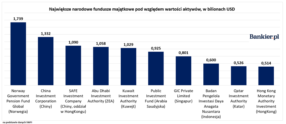 Największy majątkowy fundusz narodowy należy do Norwegii, a jego aktywa na koniec 2024 r. były wyceniane na ponad 1,7 biliona dolarów. Powstał on na bazie ustawy z 1990 r., a pierwsza wpłata rządu z pieniędzy pochodzących z handlu ropą i gazem ziemnym nastąpiła w 1996 r.