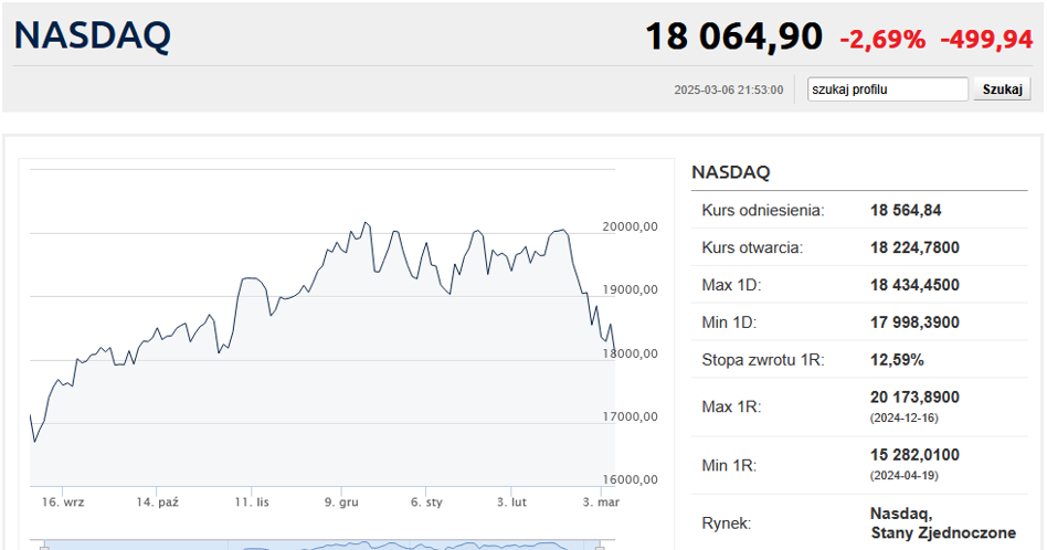 Po jednodniowym odreagowaniu w środę, S&P500 stracił w czwartek 1,78% i zszedł do najniższego poziomu od początku listopada 2024 roku, oddalając się od szczytów hossy. Jeszcze mocniejsza wyprzedaż dotknęła Nasdaq, który osunął się w dół o 2,61%, kończąc sesję z kursem widzianym po raz ostatni w październiku.