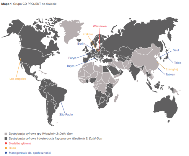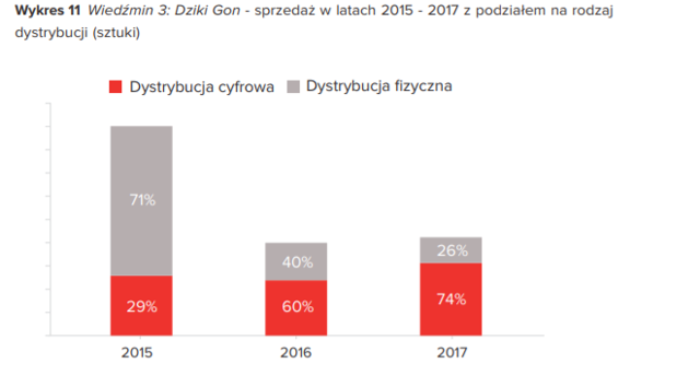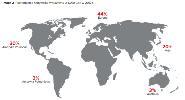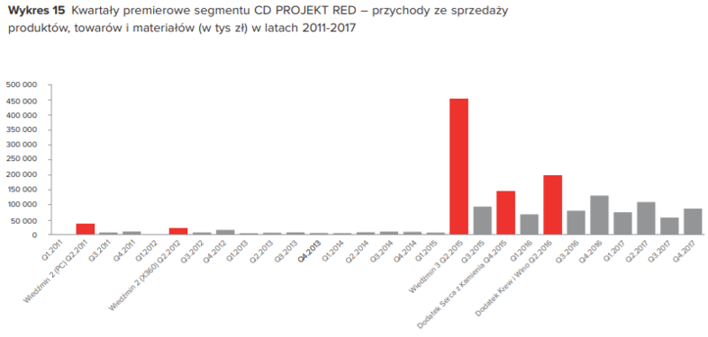 463 mln - tyle wyniosły przychody spółki w 2017 roku. Odpowiedzialna była za nie głównie seria "Wiedźmin". Lata mijają, a gry wciąż się sprzedają. Warto dodać, że w 2017 roku 95 proc. przychodów ze sprzedaży pochodziło z działalności eksportowej. 54 proc. sprzedaży realizowanej było do odbiorców w USA, a 24 proc. do odbiorców z krajów UE. Dominuje sprzedaż cyfrowa, która odpowiada za 80 proc. przychodów studia.