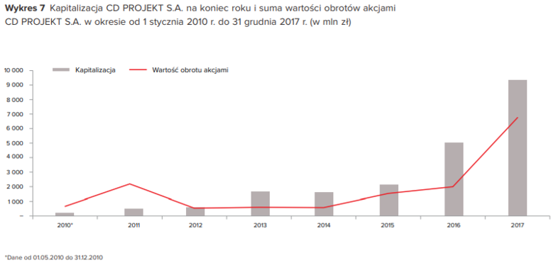 13,4 mld - to giełdowa kapitalizacja CD Projektu. Jest on 13. największą spółką na polskiej giełdzie. Znajduje się także w najbardziej reprezentacyjnym indeksie GPW - indeksie WIG20.