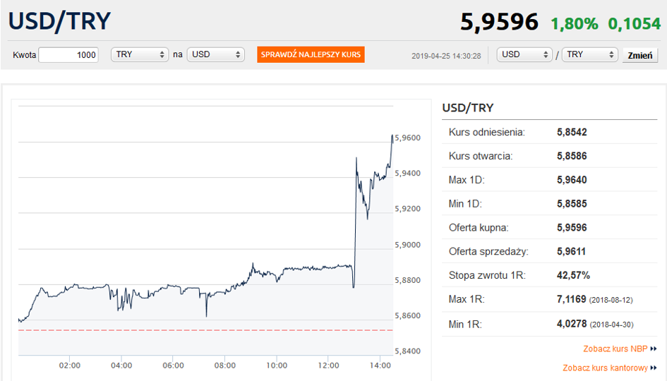 Rynek bardzo negatywnie zareagował na komunikat TCMB. O 14:18 cena dolara podniosła się w pobliże 5,96 lir wobec niespełna 5,90 lir przed godziną 13:00. Od lutego lira ponownie słabnie, regularnie tracąc wobec dolara. Od końca stycznia kurs USD/TRY wzrósł z 5,20 do 5,95 lir za dolara. To jednak wciąż wyraźnie mniej niż przeszło 7 lir, jakie za dolara płacono w szczycie paniki w sierpniu 2018.