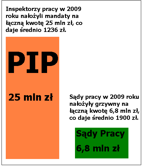 W ubiegłym roku pracownicy złożyli o 22% więcej skarg do PIP niż w 2009 roku. Z kolei spada liczba spraw kierowanych do sądu – z danych Ministerstwa Finansów wynika, że w 2003 roku było ich 360 tys., a w 2010 roku tylko 95 tys. W 2009 roku sądy pracy nałożyły na pracodawców grzywny na łączną kwotę 6,8 mln złotych, co daje średnio ok. 1900 zł. Z kolei inspektorzy pracy z mandatów zebrali 25 mln złotych, co średnio daje 1 236 zł.