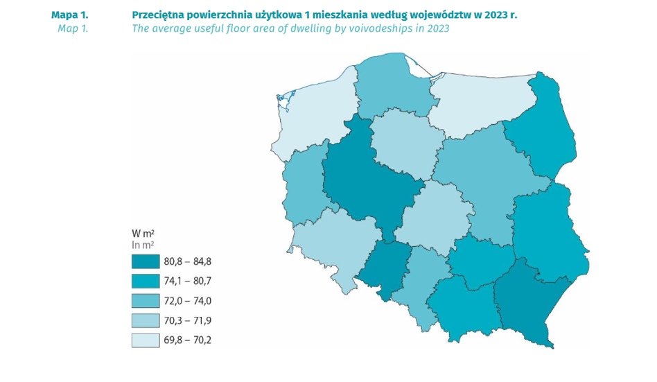 W 2023 r. przeciętna powierzchnia użytkowa mieszkania przypadająca na 1 osobę wyniosła 31,6 m2. W porównaniu z 2022 r. wzrosła w miastach z 30,4 m2 do 31, m2, a na obszarach wiejskich z 32,0 m2 do 32,5 m2. Wskaźnik ten na koniec 2023 r. w układzie regionalnym wahał się od 28,1 m2 w województwie warmińsko-mazurskim do 33,9 m2 w województwie mazowieckim. Na koniec 2023 r. w miastach najwięcej powierzchni użytkowej mieszkania na 1 osobę przypadało w województwie mazowieckim (33,3 m2), nieco mniej w wielkopolskim (32,3 m2), a najmniej w województwie warmińsko-mazurskim (27,3 m2). Na obszarach wiejskich wysoką przeciętną powierzchnię użytkową mieszkania na 1 osobę odnotowano w województwach: podlaskim (37,1 m2) i dolnośląskim (34,6 m2), a najniższą (28,9 m2) w podkarpackim. Największe różnice w wielkości mieszkań pomiędzy obszarami miejskimi i wiejskimi zaobserwowano w województwach: śląskim (ponad 38 m2 ) i mazowieckim (ponad 36 m2), a najmniejsze w województwie warmińsko-mazurskim ( ponad 23 m2).