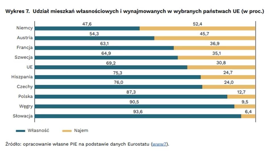 Najem mógłby w Polsce odegrać istotną rolę w zaspokajaniu potrzeb mieszkaniowych, lecz jego rynek jest za mały, m.in. z powodu złych regulacji - wynika z raportu Polskiego Instytutu Ekonomicznego (PIE). W 2023 r. mieszkania wynajmowało 12,7 proc. gospodarstw, czyli najmniejszy odsetek w UE.