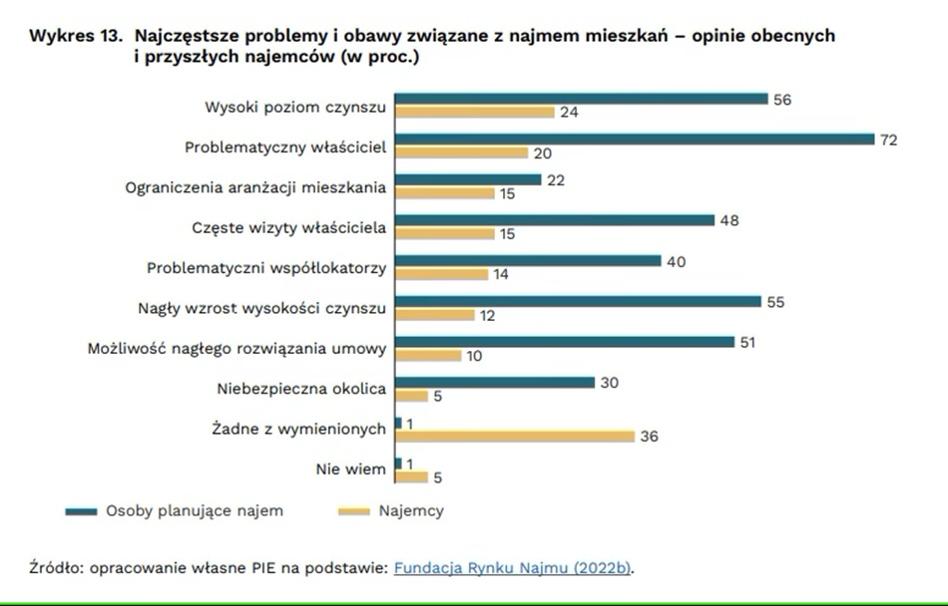Jak zaznaczyli autorzy raportu, do najbardziej istotnych problemów, które obniżają poczucie bezpieczeństwa wynajmujących należą kwestie dotyczące rozwiązania umowy i odzyskania lokalu w sytuacji, kiedy najemca nie opłaca czynszu bądź niszczy mieszkanie. Polskie przepisy umożliwiają bowiem rozwiązanie umowy najmu dopiero w sytuacji, gdy najemca zalega z opłatami czynszowymi przez trzy pełne okresy rozliczeniowe. Przy tym choćby częściowe uregulowanie zaległości przez najemcę uniemożliwia wynajmującemu rozwiązanie umowy.