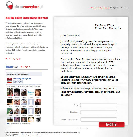 W związku ze zmianą wysokości składki jaka trafia z ZUS do OFE z 7,3% do 2,3%, Izba Gospodarcza Towarzystw Emerytalnych zainaugurowała kampanie „obronemeryturę.pl”. W jej ramach każdy internauta może wysłać list do premiera ze swoim sprzeciwem. I w zasadzie na tym się kończy. Do tej pory zrobiło to nieco ponad 55 tysięcy osób. Zgodnie z tym co napisano na stronie, teoretycznie taki list winno wysłać 15 milionów ludzi.