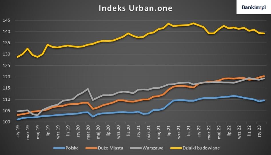 W lutym 2023 r. odczyt indeksu urban.one przygotowywanego przez Cenatorium dla Bankier.pl i „Pulsu Biznesu” wyniósł 109.56 pkt. i był o 0,46 pkt. wyższy niż w styczniu. Wzrost nastąpił po pięciu miesiącach z rzędu, w których notowane były spadki. Lutowy odczyt indeksu był jednocześnie o 1 pkt. niższy niż rok wcześniej.