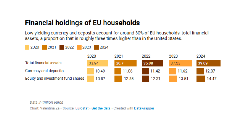 Łączna kwota tych oszczędności sięgnęła w 2024 r. 12,1 biliona euro, co stanowi około 30 proc. oszczędności Europejczyków. Dla porównania, w USA odsetek ten wynosi zaledwie 11 proc. Reuters zwraca szczególną uwagę na Niemcy, czyli największą gospodarkę strefy euro, gdzie obywatele trzymają ponad 40 proc. oszczędności w gotówce lub depozytach, a jedynie 12 proc. w akcjach. Z kolei Polacy trzymają na depozytach, czyli w przysłowiowej "skarpecie" około 70 proc. swoich oszczędności.