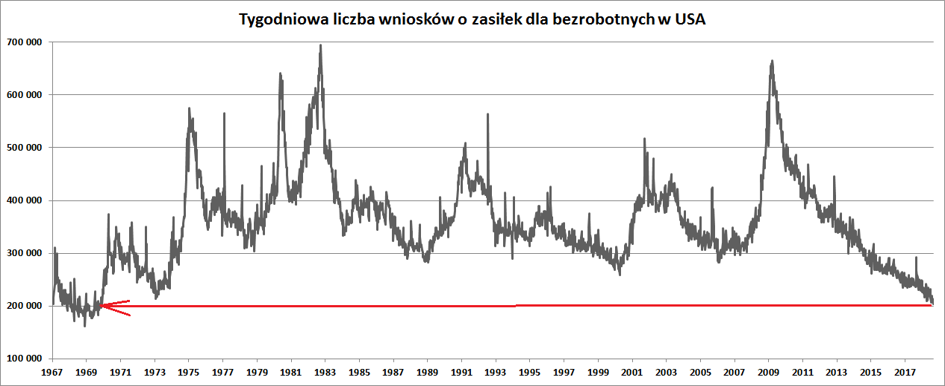 Ponieważ tygodniowe statystyki nowo rejestrowanych bezrobotnych są dość zmienne, ekonomiści lubią spojrzeć na 4-tygodniową średnią. A ta obniżyła się do 209,5 tys. i także znalazła się na najniższym poziomie od grudnia 1969. Warto tu jeszcze nanieść poprawkę na liczbę ludności. Pół wieku temu USA były zamieszkałe przez ok. 202 mln ludzi. Obecnie populację Stanów Zjednoczonych szacuje się na ok. 328 mln. A więc o ponad połowę więcej.