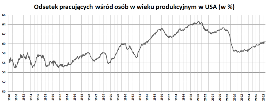 Zatem wskaźnik zatrudnienia wynosi tylko 60,5% - taki jest odsetek pracujących w populacji w wieku produkcyjnym. Dla porównania, przed recesją z 2008 roku wskaźnik ten wynosił ok. 63%, a podczas post recesyjnej smuty w latach 2010-13 wahał się między 58% a 59%. Zatem pod tym względem amerykański rynek pracy jest zaledwie w połowie drogi do odzyskania stanu z końca 2007 roku.