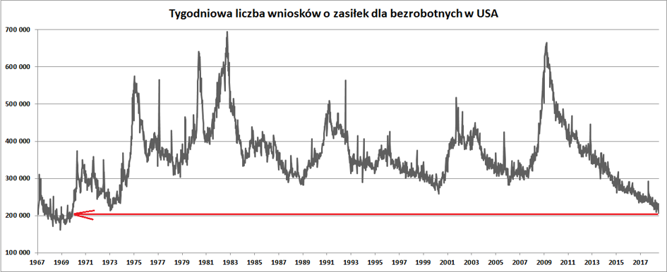 Tylko 207 tysięcy Amerykanów (to dane wyrównane sezonowo) zgłosiło się w ubiegłym tygodniu po zasiłek dla bezrobotnych. To najniższy wynik od grudnia 1969 roku! To także rezultat o 8 tysięcy niższy niż tydzień wcześniej oraz wyraźnie niższy od 220 tysięcy oczekiwanych przez ekonomistów.