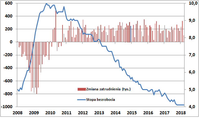Stopa bezrobocia wyniosła 4,1 proc. (najmniej od grudnia 2000 r.) szósty miesiąc z rzędu. Liczba bezrobotnych ukształtowała się na poziomie 6,585 mln, z kolei poza rynkiem pracy pozostawało 95,335 mln Amerykanów. Odsetek zatrudnionych (155,178 mln) do ogółu populacji wyniósł w marcu 60,4 proc., co stanowiło powtórkę rezultatu z lutego.