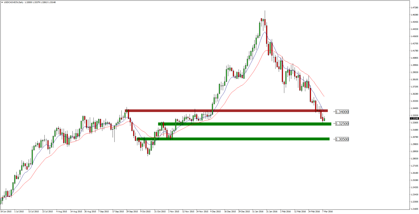 W piątek kurs pary walutowej USD/CAD przełamał poziom w okolicach 1,34; a wczoraj dotarł do obszaru wsparcia w pobliżu 1,3250. Dzisiaj trwa lekka korekta wzrostowa, a wspomniany poziom 1,34 powinien obecnie pełnić rolę oporu. Po jego obronie kurs może ponownie zaatakować strefę wsparcia w pobliżu 1,3250; a jej przełamanie otworzy drogę do 1,3050 – 1,30.