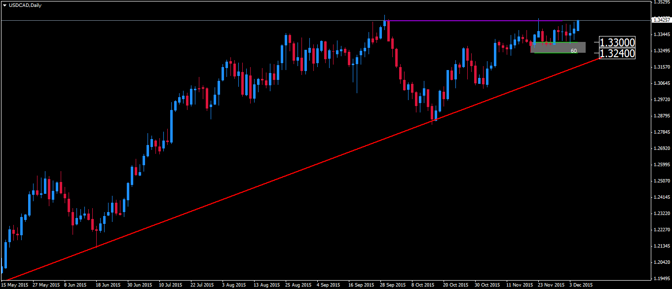 USD/CAD kontynuuje swój trend wzrostowy oraz zbliża się do ważnego oporu w okolicy 1,338-1,345. Jeżeli bykom uda się pokonać opór to będziemy mogli zobaczyć kontynuacje trendu wzrostowego nawet w okolice 1,360. Kontynuacje trendu wspiera cały czas tania ropa oraz piątkowa decyzja OPEC. OPEC zdecydował się na podwyższenie limitu produkcji z 30 milionów baryłek do 31,5 milionów baryłek ropy naftowej dziennie. Kolejnym argumentem za kontynuacją trendu wzrostowego jest planowana podwyżka stóp procentowych w Stanach Zjednoczonych już na najbliższym posiedzeniu 16 grudnia. Trend wzrostowy wspierany jest również przez linie trendu oraz strefę wsparcia 1,324-1,330 na interwale dziennym.