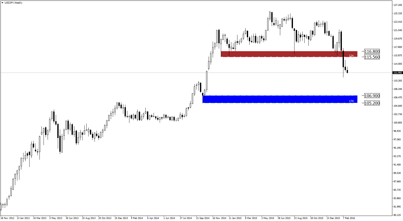 Jednakże na wykresie tygodniowym po umocnienie się jena nic nie zostało zmienione, bazowym scenariuszem pozostanie w dalszym ciągu umacnianie się jena względem dolara amerykańskiego nawet w okolicę 106,90.
