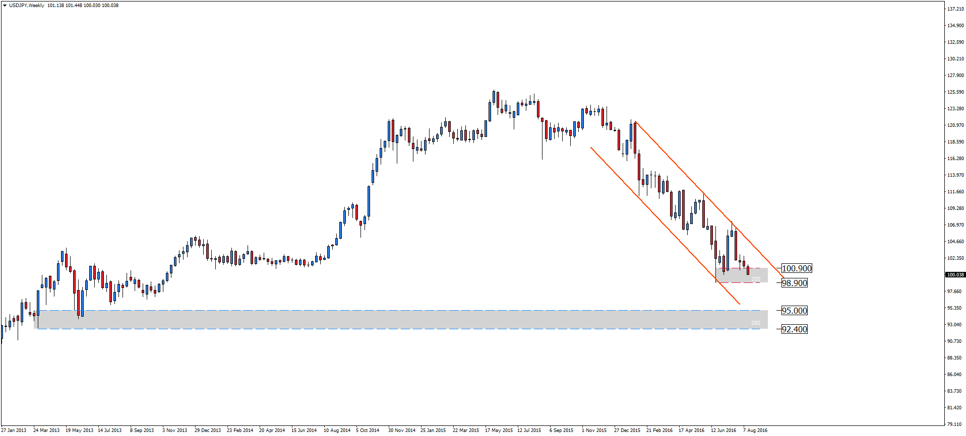 Na interwale tygodniowym para walutowa USD/JPY w dalszym ciągu znajduje się w kanale spadkowym. Aktualnie strona sprzedająca walczy o pokonanie psychologicznego poziomu 100. Bazowym scenariuszem pozostanie pokonanie danej strefy i kontynuacja trendu spadkowego.