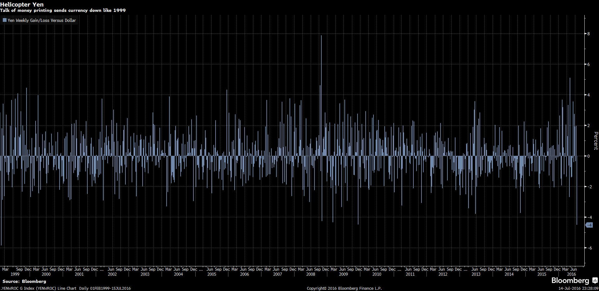W bieżącym tygodniu jen względem dolara amerykańskiego stracił najwięcej od 1999 roku.Tak duża deprecjacja japońskiej waluty związana jest z nowymi plotkami dot. stymulacji monetarnej, a także fiskalnej przez rząd oraz centralny bank Japonii. Wiadomo, że zostanie wprowadzona stymulacja rynku, jednak nie wiadomo jak będzie wyglądała.
