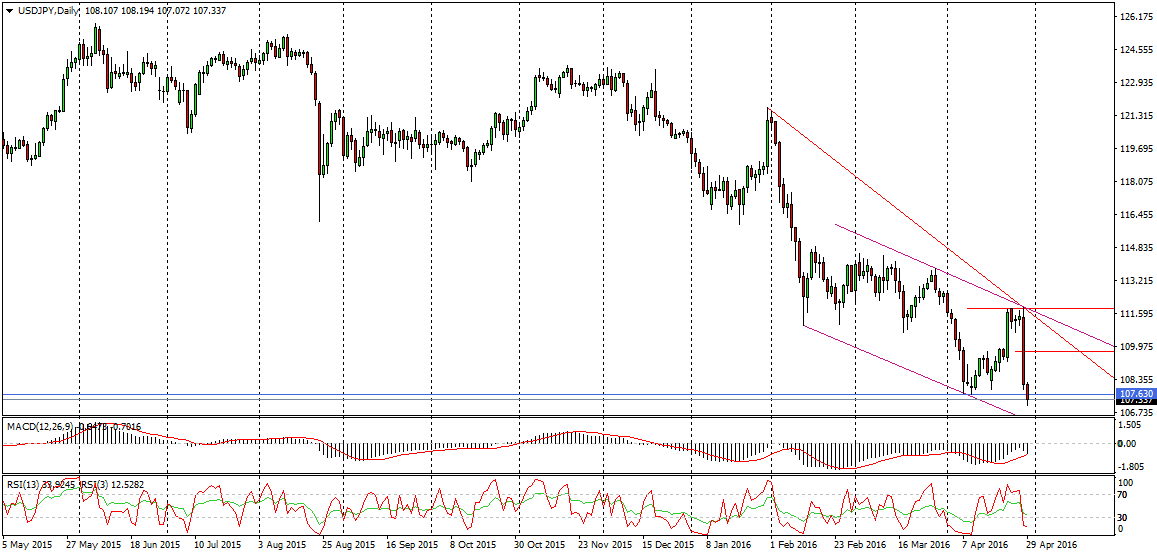Trwa przecena USD/JPY. Kurs przełamał minima z pierwszej połowy miesiąca (107,63) i ma otwartą drogę do dalszych spadków. Jeżeli para ta zakończy dzień i tydzień na obecnych (107,30) lub niższych poziomach to następnym celem będzie dołek z października 2014 roku (105,19). Przy obecnej przewadze podaży zostanie on szybko osiągnięty. Aczkolwiek, zanim nastąpi kolejna fala spadków, USD/JPY może chwilę poczekać na obecnych poziomach.