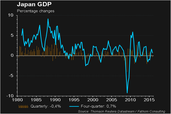 Dzisiejszej nocy poznaliśmy kwartalny odczyt PKB w Japonii, który okazał się gorszy od konsensusu. Prognozowany spadek PKB wynosił -0,3% w ujęciu kwartalnym, natomiast odczyt był gorszy o 0,1%. Na wykresie poniższym przedstawiono procentową zmianę PKB w Japonii.