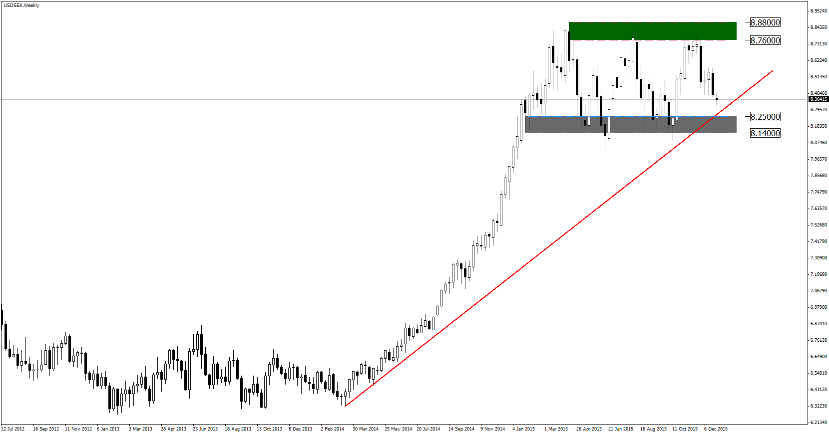 Para walutowa USD/SEK od 2014 roku znajduje się w długoterminowym trendzie wzrostowym. Głównym powodem tak mocnego trendu wzrostowego były planowane podwyżki stóp procentowych w Stanach Zjednoczonych, które już się ziściły. Aktualnie na wykresie znajdujemy się w trendzie bocznym, który rozciąga się pomiędzy wsparciem 8,25-8,14 a oporem 8,76-8,88 na interwale tygodniowym. Na ostatnim posiedzeniu Banku Centralnego Szwecji dowiedzieliśmy się o gotowość banku centralnego do interwencji i dalszego luzowania polityki pieniężnej. Jeżeli bank centralny Szwecji postanowi obniżyć po raz kolejne stopy procentowe to możemy oczekiwać dalszego osłabiania się korony szwedzkiej.