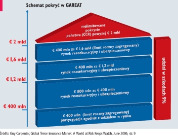 wynikłych z zakwalifikowania do terroryzmu także i ataków przeprowadzanych za pomocą broni nuklearnej. GAREAT w dzisiejszej postaci składa się z dwóch programów: dla ryzyk dużych (business interruption, majątek przedsiębiorstw) i masowych (małe przedsiębiorstwa, osoby prywatne), przy czym granicą staje się suma ubezpieczenia ustalona na poziomie 6 mln EUR. Zmianie uległa też struktura layerów (pierwotnie cztery – pierwszy jako pool tworzony przez ubezpieczycieli; drugi i trzeci gwarantowane przez międzynarodowy rynek »re« asekuracyjny i czwarty »xs 2 mld EUR« jako nieograniczony zakres odpowiedzialności państwa). Schematycznie strukturę programu dla ryzyk dużych przedstawia rysunek nr 1. Przynależność jest obowiązkowa dla członków FFSA (Federation Francaise des Sociétes d’Assurance) i GEMA (Groupement des Entreprises Mutuelles de l’Assurance) – łącznie ok. 70 zakładów ubezpieczeń, ponadto na bazie fakultatywności przystąpiło do niego także 35 innych ubezpieczycieli działających na francuskim rynku. Ubezpieczyciele tworzą pool, stanowiący pierwszy layer, odpowiadając proporcjonalnie do wielkości wniesionych ryzyk. CCR (Caisse Centrale de Réassurance) jest reasekuratorem państwowym utworzonym w roku 1946. Obecnie jest zaliczany do 25 największych towarzystw reasekuracyjnych na świecie, z rocznym przypisem składki na poziomie przekraczającym miliard dolarów i od 2001 roku o ocenie ratingowej AAA.Niemiecki Extremus AG został powołany do życia 3 września 2002 roku przez GDV (Gesamtverband der Deutschen Versicherungswirtschaft) i rząd Niemiec, i po otrzymaniu przez organ nadzoru (BAFin) zgody rozpoczął 1 listopada 2002 roku prowadzenie działalności. Akcjonariuszami jest 16 ubezpieczycieli i reasekuratorów – m.in.: Swiss Re, Munich Re, AIG Europe, ABM Generali Holding AG, Allianz Versicherungs-Aktiengesellschaft, Gerling-Konzern Allgemeine Versicherung-Aktiengesellschaft, Zürich Versicherung Aktiengesellschaft, HDI Industrie Versicherung AG. Podobnie jak w przypadku GAREAT, podstawowym jego celem stała się ochrona ubezpieczonego majątku i business interruption. Cesji poddawane są, na zasadzie fakultatywności, ryzyka o sumie ubezpieczenia przekraczającej 25 mln EUR. Maksymalna odpowiedzialność w stosunku do pojedynczego podmiotu ustalona została jako 1,5 mld EUR, sama pojemność akceptacyjna programu ograniczona jest do 10 mld EUR, przy czym 2 mld EUR stanowiące pierwszy layer wyznacza limit odpowiedzialności ok. 50 ubezpieczycieli i reasekuratorów. 8 mld xs 2 mld EUR gwarantowane jest przez państwo. EXTREMUS AG stanowi pokrycie dla szkód wynikłych z pożaru, eksplozji, napaści i rozbicia statku powietrznego i innych środków komunikacji. Z zakresu odpowiedzialności wyłączone są szkody powstałe w wyniku oddziaływania energii jądrowej, substancji radioaktywnych, lecz także z zastosowania broni chemicznej i biologicznej (ATB A1.1), co powinno budzić zdziwienie, szczególnie mając na względzie poszerzanie rozwiązań dotychczas istniejących właśnie o zakres broni chemicznej, biologicznej i nuklearnej. Na fali wydarzeń wrześniowych również w Holandii został powołany do życia program pokrywający ryzyka terrorystyczne. Z początkiem roku 2003 rozpoczął działalność powołany przez ministerstwo finansów i Verbond Van Verzekeraars (VVV – podmiot zrzeszający ubezpieczycieli holenderskich) reasekurator – Nederlandse Herverzekeringsmaatschappij voor Terrorismeschaden (NHT). Regułę stanowi cedowanie ryzyk na podstawie indywidualnych kontraktów z poszczególnymi ubezpieczycielami, przy czym sama cesja wykazuje charakter właściwy kontraktom reasekuracji obligatoryjnej. Górny limit odpowiedzialności wynosi 1 mld EUR na jedno i wszystkie zdarzenia w ciągu roku – jeśli suma szkód przekroczy tę wartość, odszkodowanie wypłacane ubezpieczonym zostanie zredukowane proporcjonalnie do dostępnej pojemności.