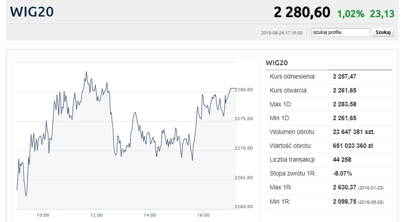 | WIG 20 | Polska | 2280,60 | 1,02 | 3,15 | -1,39 | -8,07 | -7,34 |