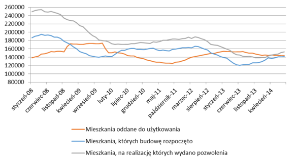 Stabilniej wygląda odczyt liczby mieszkań oddanych do użytkowania. W samym sierpniu było ich 3574 (o 1,68 proc. mniej niż w sierpniu 2013 r.), od początku roku wartość ta wynosi 34,4 tys.(o 2,9 proc. więcej niż rok wcześniej), a w ostatnich 12 miesiącach 58,3 tys. (o 2,2 proc. mniej niż rok wcześniej).