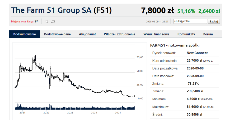 We wtorek, spekulacyjny popyt wziął za cel także akcje The Farm51, a więc studio gier z NewConnect, które zaktualizowało swoją strategię i ogłosiło, że drugim filarem działalności będzie rozwój technologii dronowych, także w środowisku walki radioelektronicznej. Kurs spółki po komunikacie zyskiwał przeszło 51 proc. do 7,80 zł, chociaż warto pamiętać, że od kilku lat jest w potężnym trendzie spadkowym i wciąż traci w tym roku ponad 40 proc. Wzrosty w odpowiedzi na komunikat dziwią, tym bardziej że o wejściu w segment dronów spółka informowała już w maju i sierpniu, gdy komunikowała o kolejnych etapach w procesie o dotację dla swojego projektu dronowego.