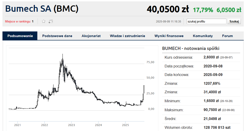 W obecnej fali wzrostów kurs zyskał przeszło 370 proc. od końca lipca, a tylko od początku września kurs zyskał 140 proc., meldując się na poziomie 40,45 zł, niewidzianym od marca 2023 r. 3 września spółka poinformowała, że podpisała umowę (poprzedzoną lipcowym listem intencyjnym) o współpracy z OTT Technologies z siedzibą w RPA w zakresie produkcji i rozwoju pojazdów opancerzonych na rynek europejski.