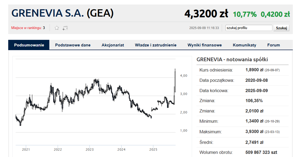 Inną spółką, która zyskuje po komunikacie giełdowym zwiastującym plany wejście w sektor obronny, jest Grenevia, czyli dawny Famur (obecnie podmiot z Grupy Grenevia), produkująca sprzęt górniczy. Spółka 5 września poinformowała, że podpisała z Polską Grupą Zbrojeniową list intencyjny o współpracy. Po komunikacie kurs spółki na następnych trzech sesjach zyskiwał nawet 78 proc. do 4,48 zł za akcję, odnotowanych w czasie wtorkowego handlu. Kurs znalazł się najwyżej od wakacji 2019 r. Prezes Famuru w rozmowie z Bankier.pl studził jednak oczekiwania inwestorów, podkreślając, co warte uwagi także w kontekście innych spółek, że wejście w każdą nową branżę wymaga dużo czasu i cierpliwości.
